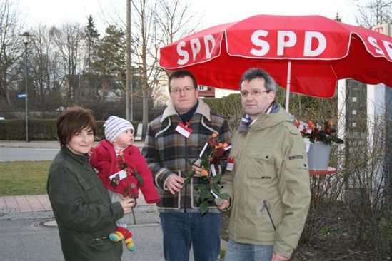 Die Vorstandsmitglieder des SPD-Ortsvereins Asbach-Bäumenheim Christian Scholz (rechts) und Thorsten Kelichhaus und der Pressewart Josef Hörmann (nicht auf dem Bild) verteilten zum Internationalen Frauentag im Ortskern von Bäumenheim Rosen an die Frauen. Die Aktion stand unter dem Motto: Frauen verdienen mehr! Zunächst überrascht bedankten sich alle beschenkten Frauen mit einem Lächeln.