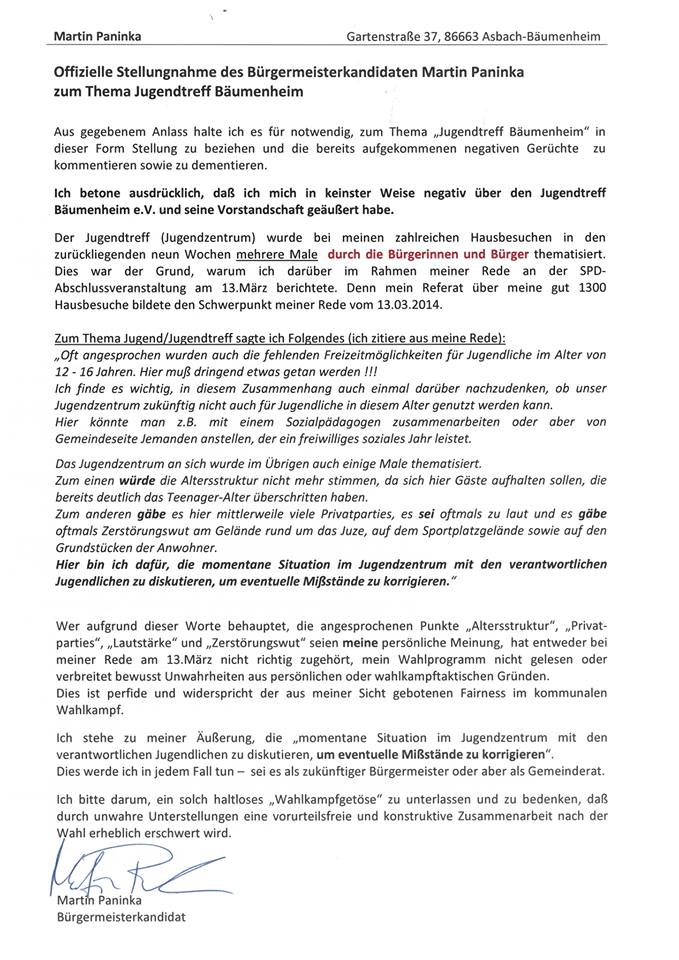 Nachdem wie es den Anschein hat Gerüchte und Verleumdungen bewußt von bestimmten Personen in Umlauf gebracht werden möchte die SPD und ihr Bürgermeisterkandidat Martin Paninka eine Stellungnahme zum Jugentreff abgeben.